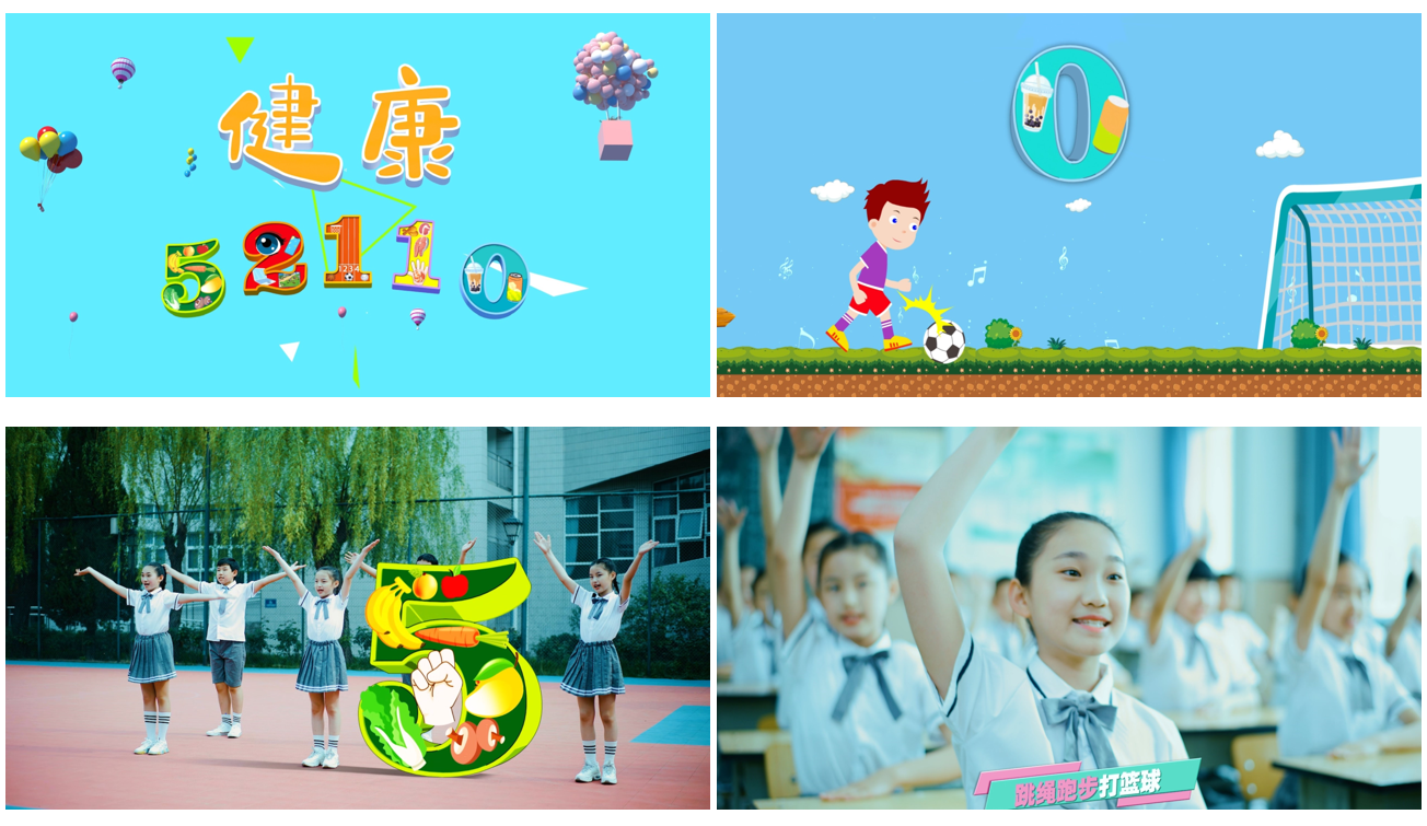 《健康52110》微视频主要根据国家《学生重大疾病防控技术和相关标准研制及应用》课题研究成果中的“中小学生每日健康饮食与运动规则”“52110”进行创作,通过学生喜闻乐见的音乐节奏和表现形式(真人与动画交互式音乐短片),准确地介绍了儿童青少年肥胖的常见病因、危害、判定标准和预防措施。作品针对常见的学生行为误区,将健康教育与音乐有机地融合,视觉艺术表现形式新颖、构思巧妙、创意独特,对学生养成健康行为有很好的引导和示范作用,是对现有学校肥胖防控健康教育形式的有益探索。