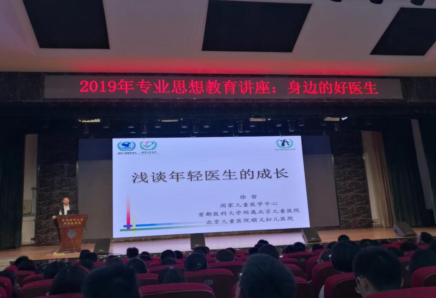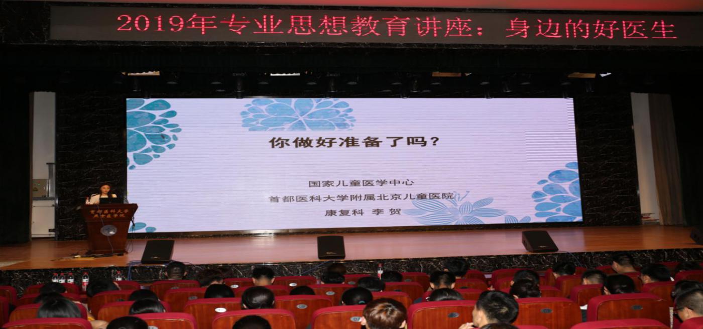 附属北京儿童医院康复科青年医生李贺做“身边的好医生”专业思想教育讲座。院长杨红、党委副书记崔群颖以及近400名师生共同参加了此次讲座。