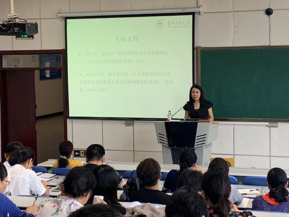 赵处长首先介绍了修改制定2019版学籍管理规定的背景,指出新的学籍管理规定是为贯彻《普通高等学校学生管理规定》(中华人民共和国教育部第41号令)和《关于狠抓新时代全国高等学校本科教育工作会议精神落实的通知》(教高函〔2018〕8号),同时针对工作中出现的新情况、新问题进行的修订。培训会上赵处长还针对新的学籍管理规定要点进行了详细解读,包括入学注册、转专业、课程考核与成绩记载、升级与留降级、退学、休学、毕业与结业等内容。其中重点强调了:取消了毕业前清考,本规定适用于在籍的所有学生;有关退学的相关规定;课程考核与成绩记载,强调了过程性评价的重要性;学校鼓励支持和指导学生参加社会实践、创新创业活动等规定。