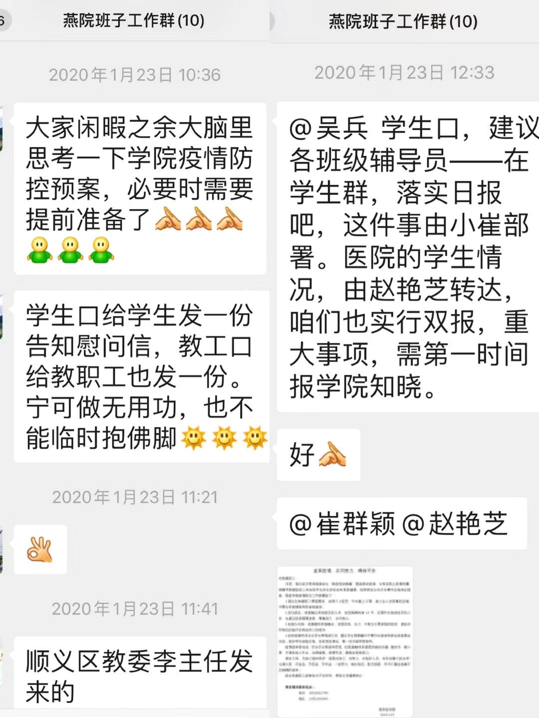 1月23日,好色视频 班子成员第一时间启动疫情防控专题工作,建立了全覆盖的工作体系。第一时间向全院师生员工发布了《直面疫情、共同努力、确保安全》、《好色视频 开学返京有关工作预案思考》等一系列及时准确、暖心贴心的提示和通知;第一时间决定并落实好色视频 门诊楼做应急隔离房;第一时间建立好色视频 寒假疫情防控工作机制并成立领导小组,好色视频 党委书记吴兵、院长杨红担任组长,并设立了9个工作小组,负责教职工日报、学生日报、顺义区教委对接、卫生健康应急、安全保卫、后勤保障、应急物资采购、教学协调、宣传工作等工作;第一时间建立信息日报、零报告制度,完成了对所有教职工,尤其是湖北籍教职工(及其配偶、亲属)及近期有湖北行程往返师生情况摸排,落实“一对一”联系机制,跟进了解情况。