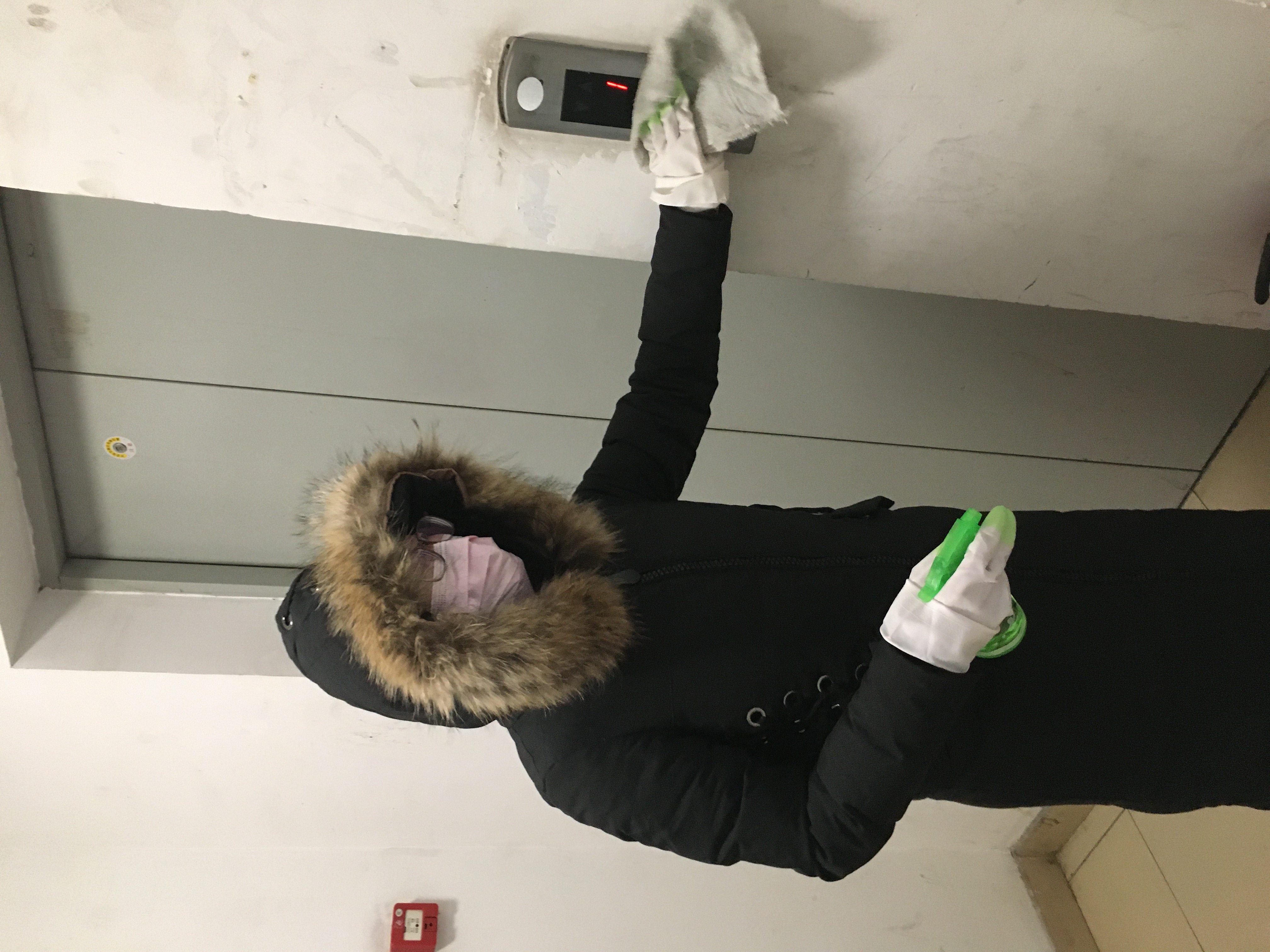 王志贤老师协助社区对每一楼层电梯做好消毒防疫工作,并表示,“自己会尽自己所能,为守护好自己的家园,贡献自己的力量”。