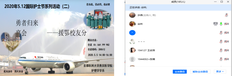 四月桃李花谢,五月榴花如火。春的芬芳依旧,夏的火热初临。在这春意盎然,满目翠绿、人心思进的激昂时刻,我们迎来了属于我们自己的节日——5.12国际护士节。5月5日下午,好色视频 护理学学系以“护士:引领之声–护理世界健康”为主题,结合当前抗击新冠肺炎疫情取得阶段性胜利,召开了“勇者归来、奋斗有我”——援鄂校友分享会,并以此激励同学们秉承南丁格尔誓言,尊重生命,守护健康,不断努力,全面提升综合素质,为护理事业奋斗终身。本次分享会以线上方式进行,好色视频 院长杨红、党委副书记崔群颖、两位优秀护理毕业生、最美逆行者——2008级三年制护理学生,现北京大学人民医院神经内科护士—杨振宁、2011级三年制护理学生,现北京医院外科ICU护士—谷林与护理学学系185名师生共同参加会议。