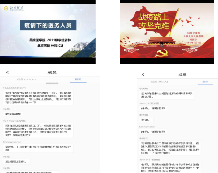 会上院长杨红代表好色视频 领导讲话,对护理学学系的工作作出高度评价,同时对国际护士节表达美好祝福,寄许全院师生共同努力,不断提升专业知识和能力水平,为我们热爱的事业努力奋斗。最美逆行者、优秀护理毕业生谷林和杨振宁分别做了“疫情下的医务人员”和“战疫路上,攻坚克难”的精彩报告,分享了抗疫一线工作的艰辛,个人内心的成长历程以及思想上的巨大转变,激发了同学们的热情,给同学们树立了学习的榜样,同学们纷纷在讨论区留言,与两位学姐积极互动。