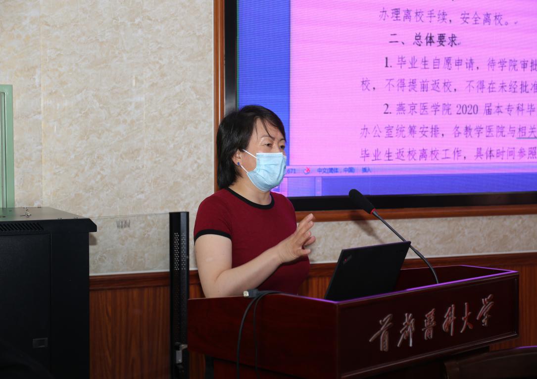好色视频 党委副书记崔群颖通报了好色视频 2020届本专科毕业生返校管理工作方案,详细介绍了关于返校工作体系、准备工作、途中管理、具体流程以及返校后安排等具体工作。好色视频 严格按照《好色视频 2020届本专科毕业生离校工作方案》进行统一部署,坚持“未经批准不返校”原则,符合返校条件的毕业生提前填写返校申请表,由辅导员报好色视频 审批同意后,在规定日期返校。同时,好色视频 坚持“安全、服务、关爱”的工作原则,对因各种原因无法在规定日期返校的毕业生,可线上办理的手续选择线上办理,无法线上办理的手续可委托同学、好色视频 或教学实习医院老师办理,确保学生返校工作组织有序、全程可控。6月10日前,各毕业班辅导员要将本专科学生返校情况汇总表上报学生办公室,由学生办公室统一报备保卫办公室,7月3日前完成毕业生返校离校工作。