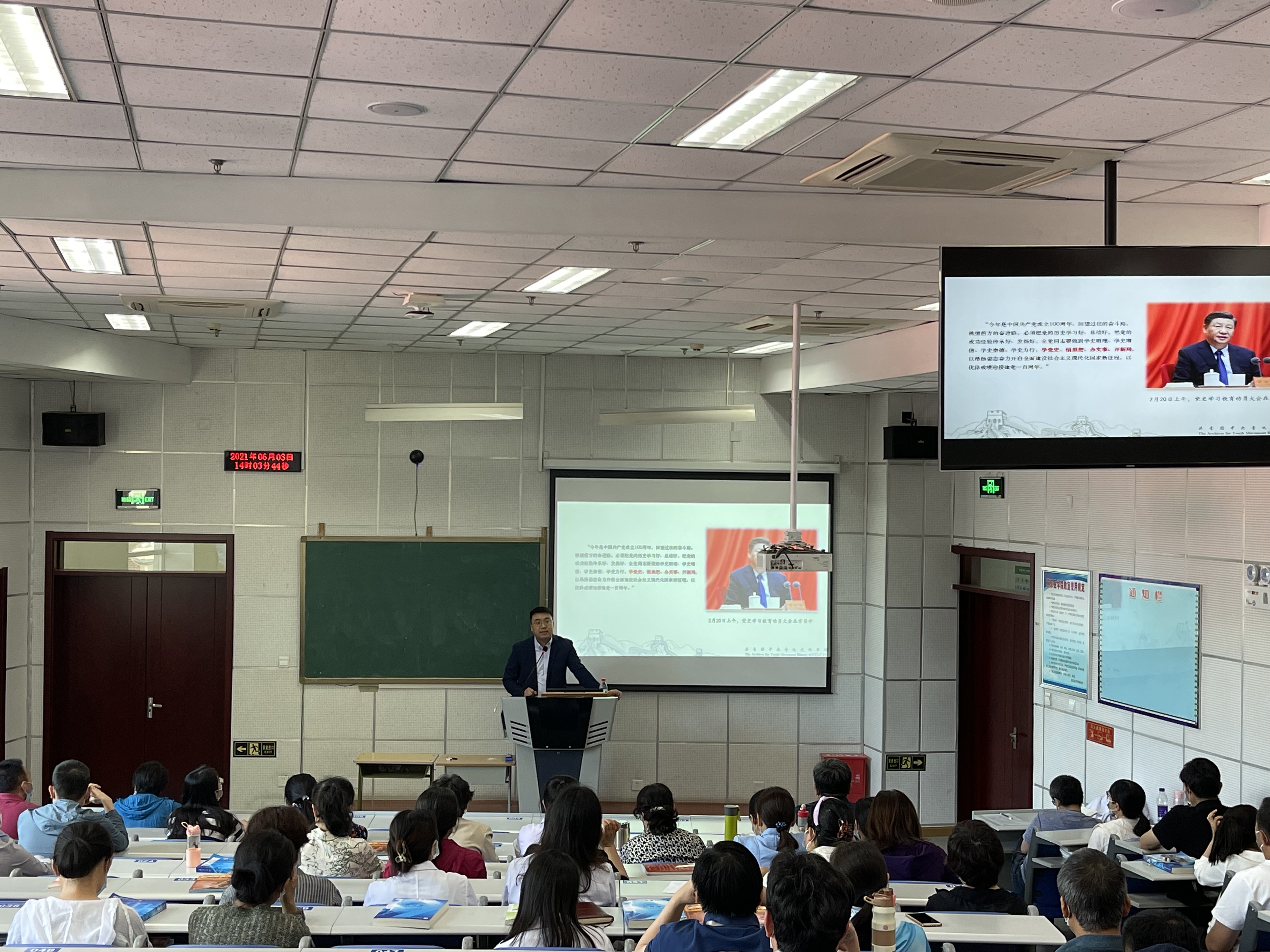 马金祥老师从生动的党史故事切入,现场带领师生们分别从中国共产党的创建、投身大革命的洪流、掀起土地革命的风暴、全民族抗日战争的中流砥柱、夺取新民主主义革命的胜利、中华人民共和国的成立和社会主义制度的建立七个阶段重温了中国共产党从1921年至1956年的光辉历程。他强调,中国共产党百年历史是一部不懈奋斗史、思想探索史、自身建设史,这一百年是矢志践行初心使命的一百年,是筚路蓝缕奠基立业的一百年,是创造辉煌开辟未来的一百年。
