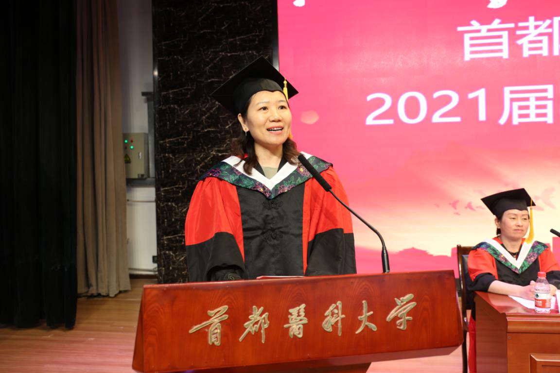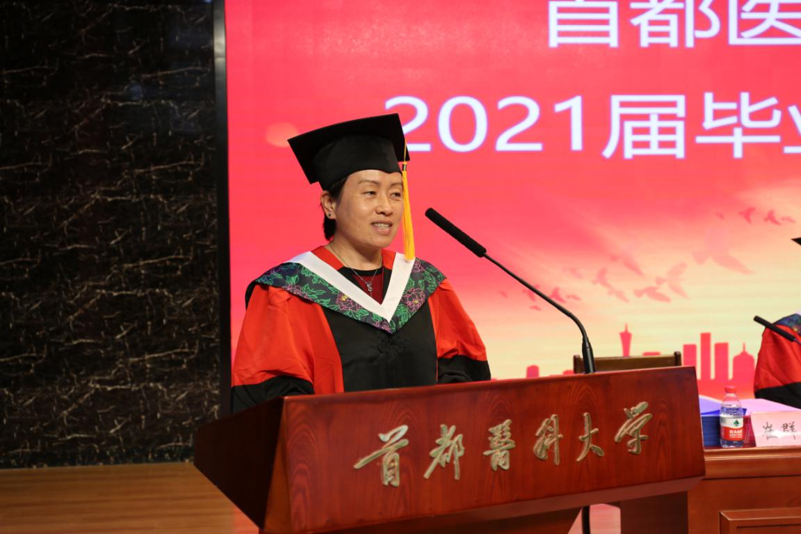 临床医学学系主任鄢雯作为教师代表发言,为毕业生们送上四个锦囊。一是不忘学习,无论是走向工作岗位,还是继续深造,都能够不断地、踏实地学习新的知识,充实自己。二是学会做人,要有健康的体魄和健康的心理状态,每天都能寻找到学习、工作、生活中的快乐。三是学会做事,始终保持一种平和的心态,虚心向他人学习,真诚向时间请教。四是不忘初心,要时刻不忘学医初心,牢记健康使命,将来能够成为有温度、有责任、有担当的人民满意的健康“守门人”。