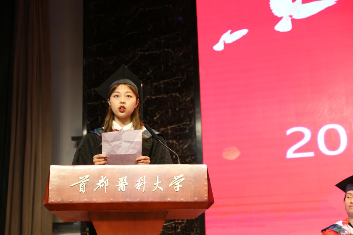 优秀毕业生代表、2016级预防医学专业刘新颖在发言中深情回顾了自己大学生活的点点滴滴,为遇到和蔼可亲的领导老师、志同道合的同窗好友感到开心幸运,也为拥有五年的精彩大学生活而感到自豪荣耀,亦因即将毕业离开母校、与老师同学分别感到依依不舍。最后代表全体同学为母校送上了美好祝福。