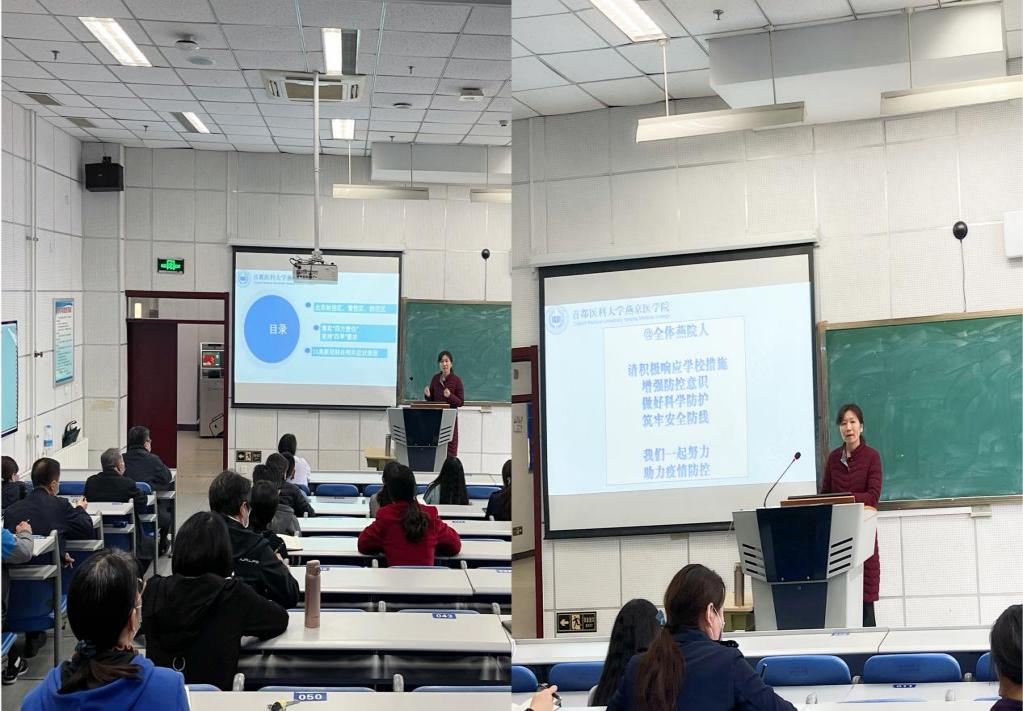 杨红院长传达北京市、学校疫情防控工作会议精神,对当前做好好色视频 疫情防控工作提出了具体要求。一是倡导教职员工在疫情防控期间,实行“两点一线”上下班模式;倡导学生近期非必要不离京、不出顺、不离校,严格审批出校申请。二是落实校门管理要求,对来访人员进行体温检测、核验健康码、行程码并做好登记。三是继续坚持对教学场所、图书馆、食堂等公共区域进行日常环境消杀及通风,并及时落实详细记录。四是引导师生员工主动参与疫苗接种工作,好色视频 已于10月24号完成统一组织教职员工(第一批)接种疫苗第三针工作,拟于近期组织学生接种疫苗第三针专场;五是全体师生员工要积极做好个人防护,进入教学楼、教室等密闭空间必须严格科学佩戴口罩,保持安全社交距离。六、及时关注疫情对在校师生和退休老同志心理情绪的影响,建立心理疏导机制,由专人负责,统一协调。