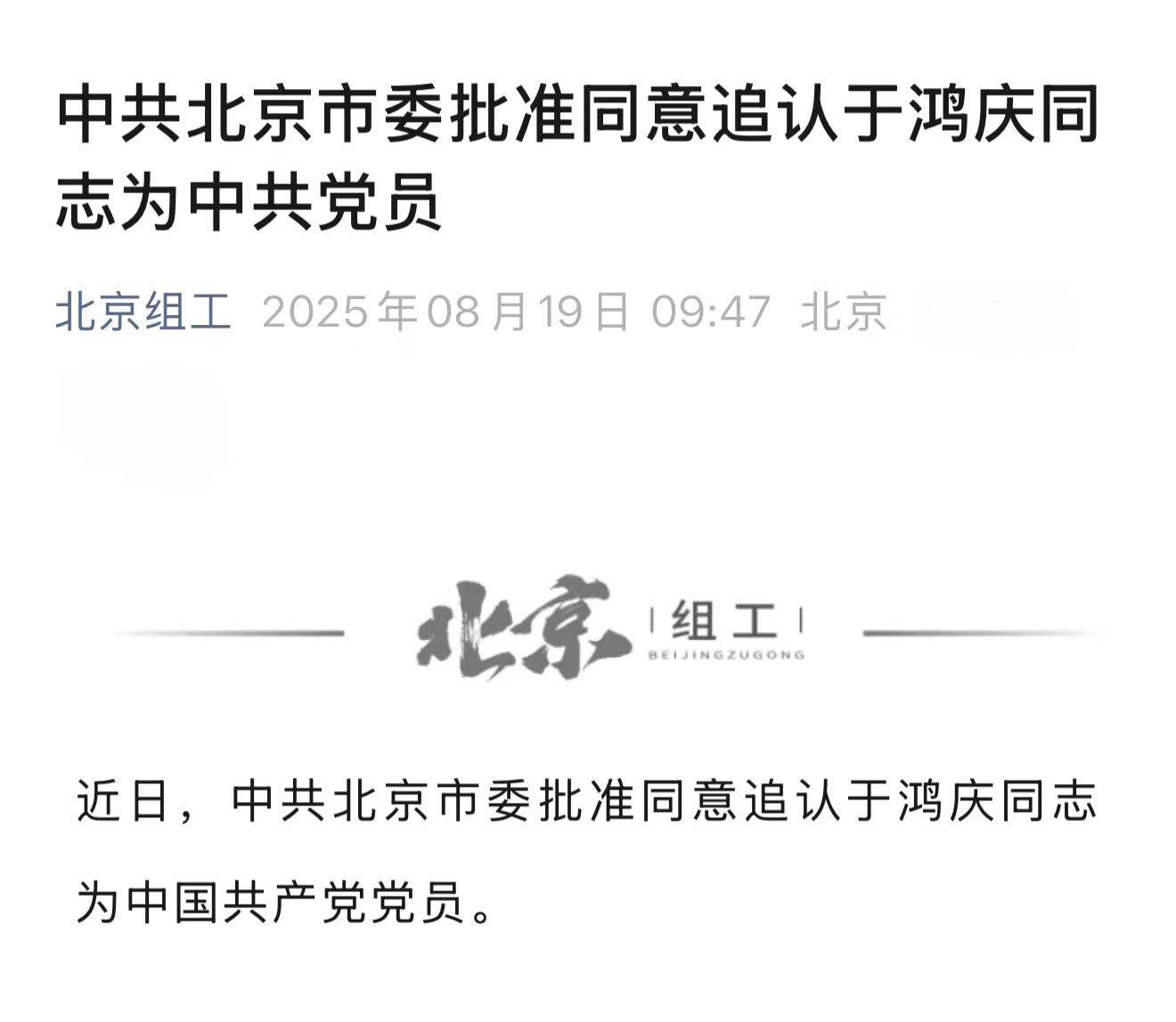 近日,基于于鸿庆同志生前的入党愿望及其一贯优秀表现,尤其是在防汛救灾紧急关头,他义无反顾奔赴救援一线,并在洪水袭来时坚持先人后己、舍身救人的英勇行为,中共北京市委正式批准追认他为中国共产党党员。他以青春和生命践行了医者的崇高使命,其英勇事迹与奉献精神,必将永远为我们所铭记。