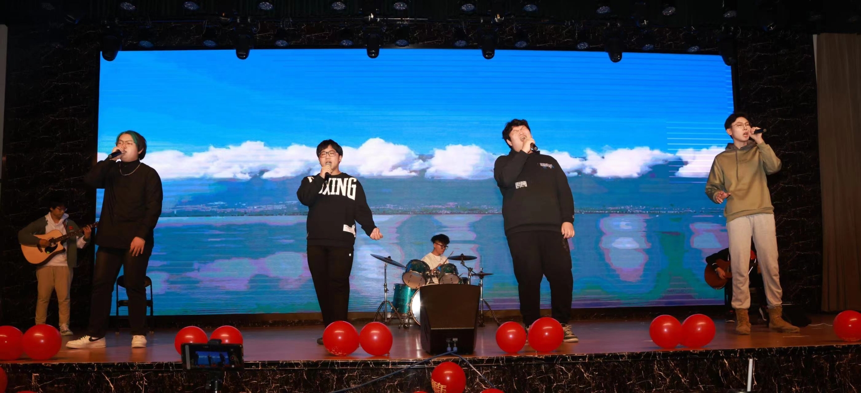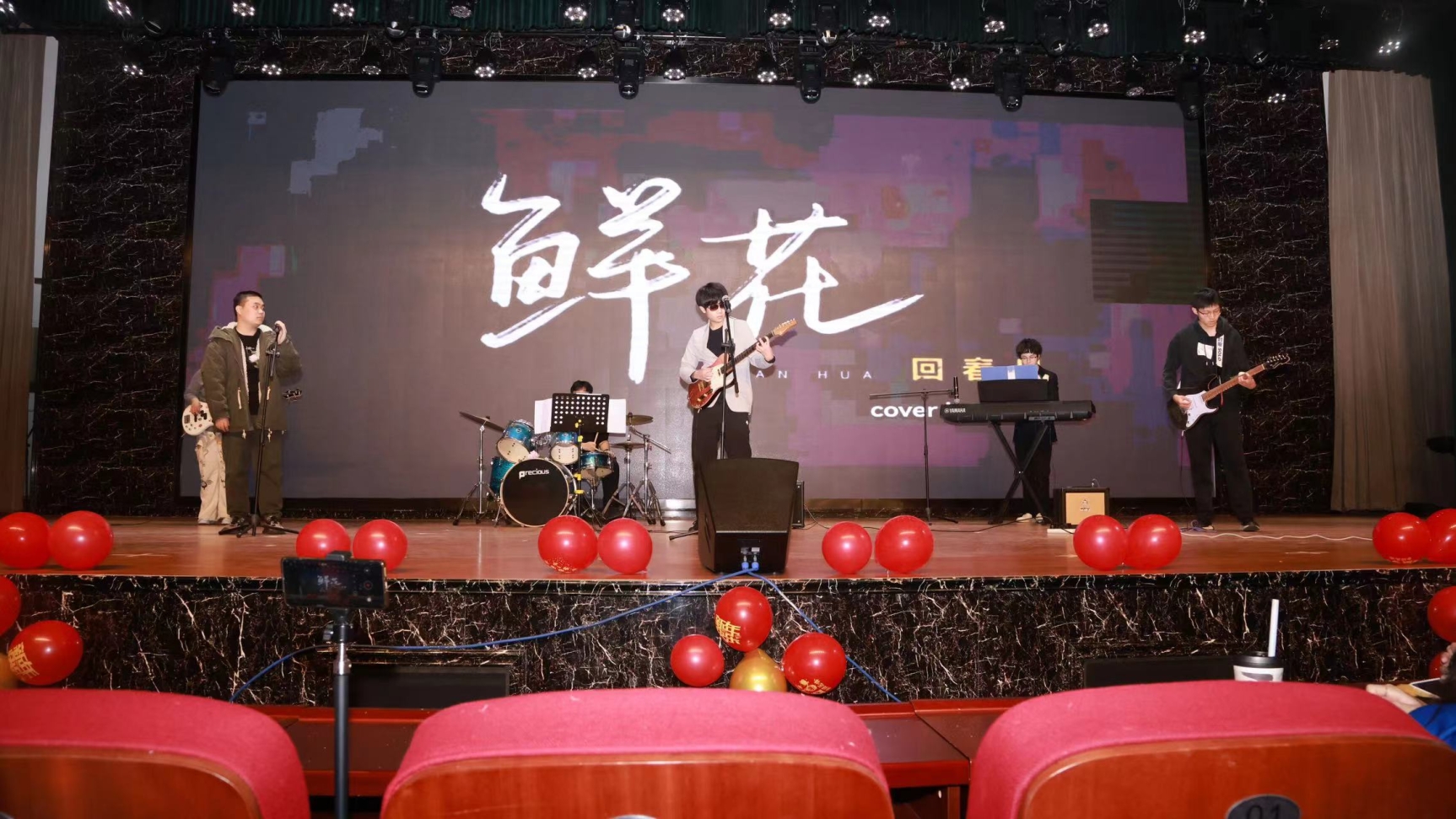 两组学生乐队分别翻唱了经典歌曲《海阔天空》、《鲜花》,引发全场大合唱。