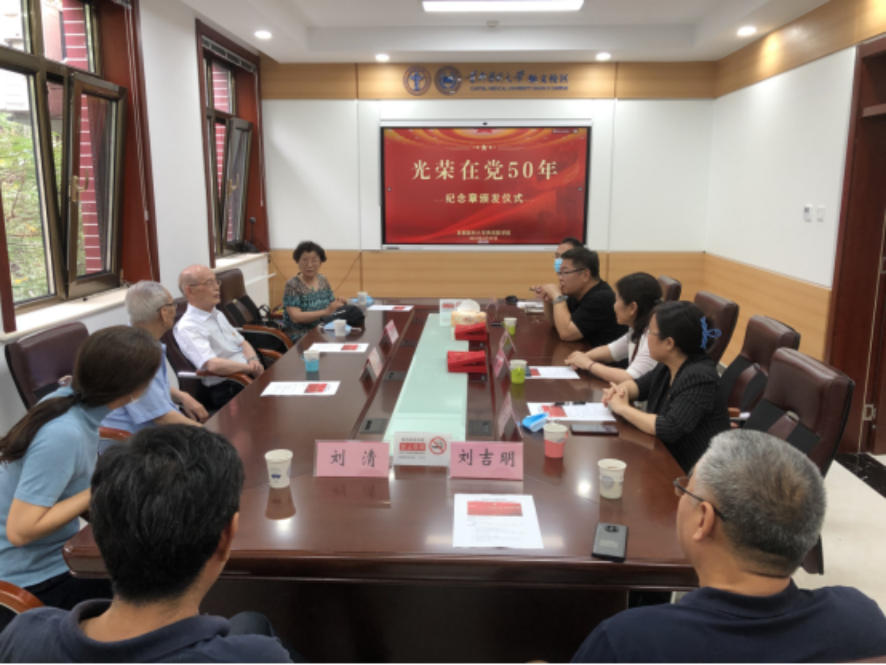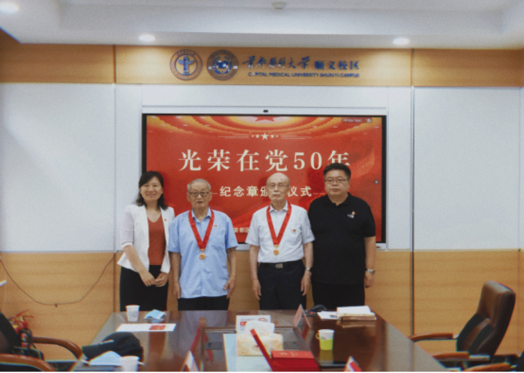 座谈会最后,党委书记汤海新、院长杨红按照学校组织部要求为王金瑞、王兰山两位退休老党员颁发了“光荣在党50年”纪念章。