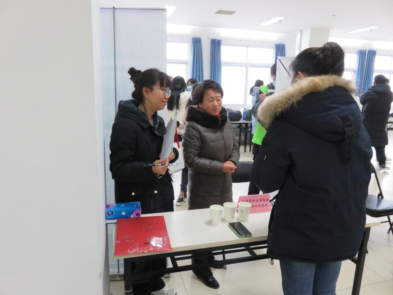 12月12日上午十点,在好色视频 餐厅三层学生活动中心多功能大厅,七家医院如期就位。应聘学生手持自己精心准备好的简历,充满自信,积极和招聘医院工作人员交流,主动了解用人单位情况。本次招聘会共有近百名学生投递了个人简历,3家医院现场面试70余人次,现场达成就业意向20余人。上午,我院分管就业工作的崔群颖副院长到招聘会现场与各家医院招聘人员一一进行见面沟通,希望通过校院合作,加强联系,共同推进毕业生就业,同时满足医院用人需求。