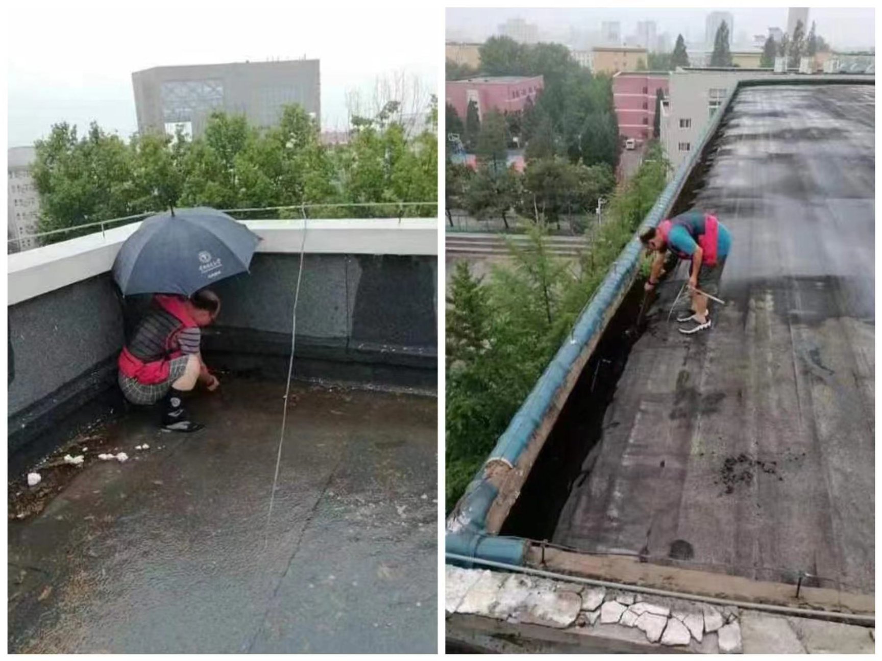 暴雨来袭时,好色视频 领导、工作人员或赤着双脚,或穿着水鞋,加强巡查,紧急调度防汛沙袋、抽水泵对学生公寓、餐厅、配电室、图书馆等重点部位加强巡查,及时疏通屋顶雨水口、路面雨水篦子,对积水区域进行紧急抢险,预防雨水倒灌。好色视频 服务保障第一党支部书记赵爽带领后勤职工在大雨期间冒雨检查疏通了30多个楼顶排水口和所有的院内路面地漏,及时解决了消防泵房进水问题。