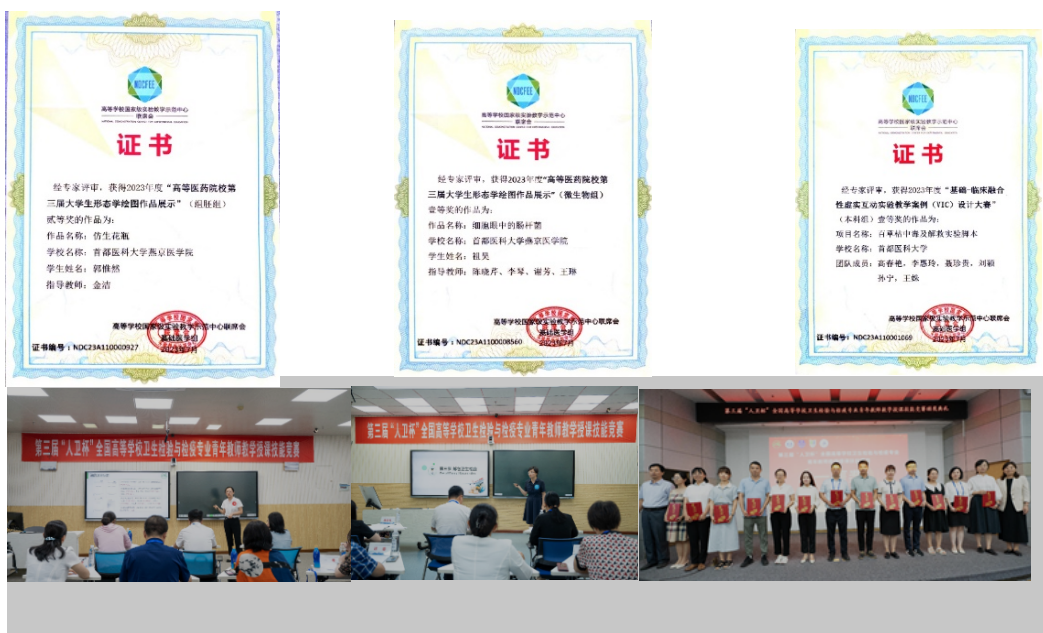 2023年7月,我院检验学学系高春艳老师等设计的《百草枯中毒及解救实验脚本》(团队成员:高春艳、李惠玲、聂珍贵、刘颖、孙宁、王姝)荣获2023年度高等学校国家级实验教学示范中心联席会“基础-临床融合性虚实互动实验教学案例(VIC)设计大赛”(本科组)一等奖。