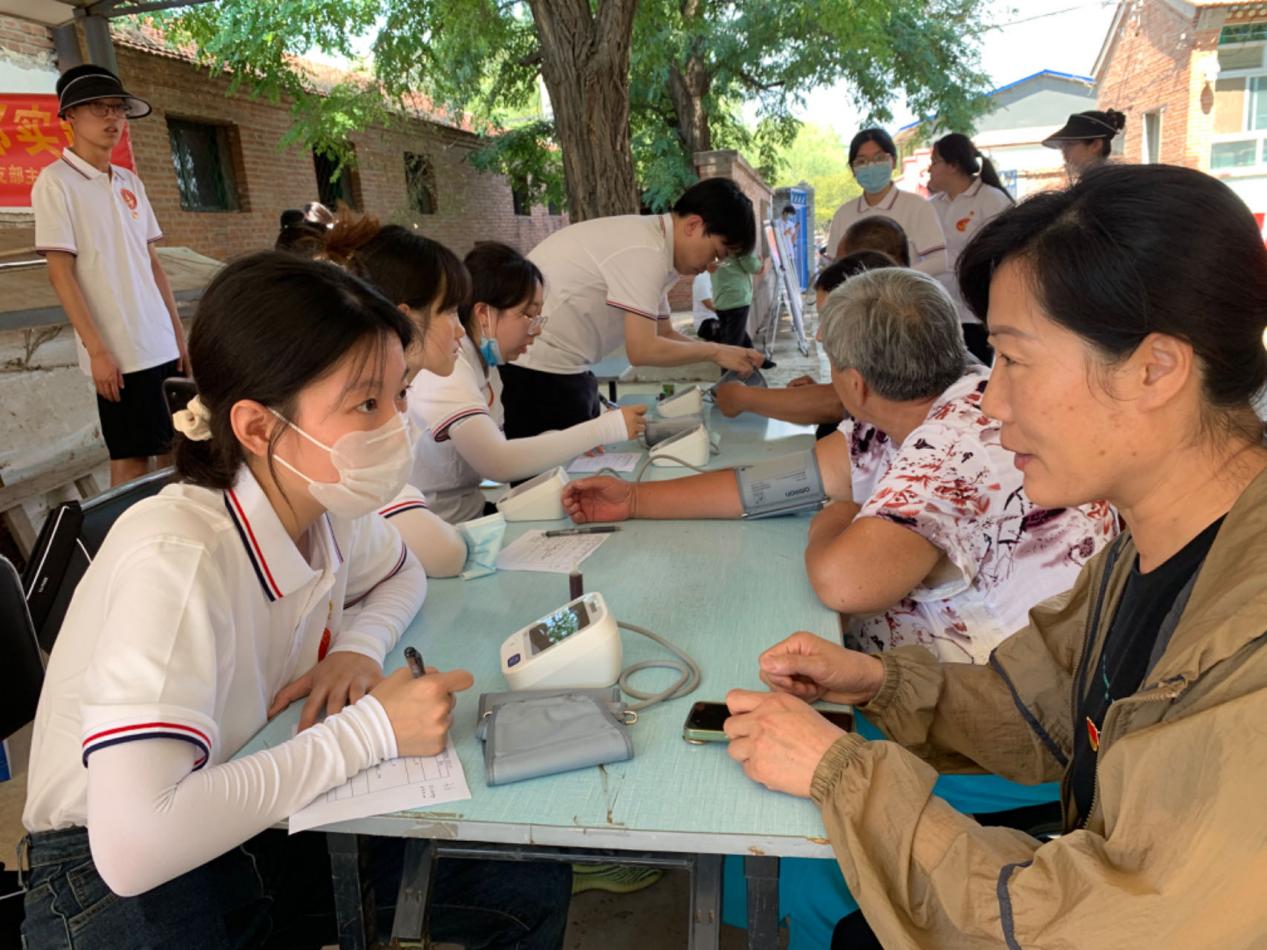 本次主题党日活动前期进行了充分沟通,安排了健康知识宣讲、中医理疗和义诊、访谈村党支部老党员和走访村卫生室等活。学生党支部26名学生党员分别承担健康知识宣讲、海报制作、物资准备、现场组织、村民健康信息收集等工作。经过了多日的精心策划和准备,7月11日上午,在山里辛庄村委会大院,活动在村民们的期待中火热开展。学生党员程序、赵浩然承担了健康知识宣讲的任务,他们充分调动自身专业知识,结合搜集的资料,向村民科普夏季常见病的判断与预防,并结合村庄居民的构成特点,普及老年人、幼童和慢病患者健康照护的注意事项,讲解中充分的互动吸引了村民们的注意力,活动效果初显。义诊活动受到了村民的广泛欢迎,参加实践的中医师毕老师和理疗师李老师带领临床医学专业与护理专业的同学开展了义诊活动。学生党员们收集现场村民的身高、体重、血压、既往病史等基础信息并制作表格,引导村民们有序排队进行中医诊疗和体验理疗保健,参加义诊的村民还获得了我们精心准备的用于日常生活应急的医疗资源包。虽然骄阳似火,却丝毫没有挡住村民参与活动的热情。从早上8点半直到中11点半,村中的中老年人、儿童和带幼儿的妈妈,陆陆续续约八十人次来到活动现场咨询、学习、参加义诊和体验。这样的场面使团队师生大受感动并深深地体会到:在基层,在农村,人们对健康和医疗卫生的渴求与期待。在感动中,大家渐渐感到作为一名医学生的责任之重。参与活动的村民们忍不住赞叹到:“你们这个活动太棒了,欢迎你们再来!” 一位坐轮椅前来参与活动的爷爷深受感动真诚地说到:“共产党好,为人民考虑,你们这些孩子大热天也不容易,多注点意不要中暑!”