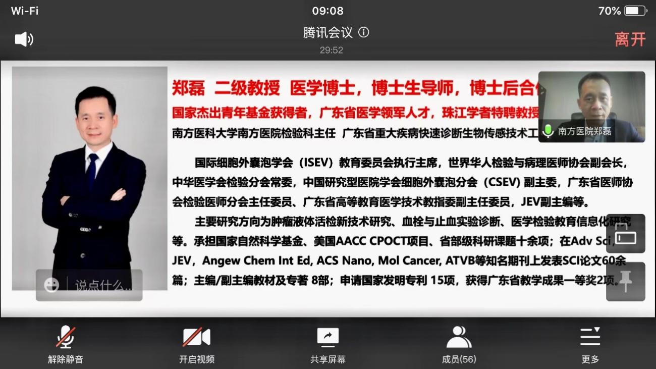 为促进一流专业建设,助力学术研究,11月13日,我院检验学学系邀请南方医科大学南方医院检验医学科主任、国家杰出青年基金获得者、珠江学者特聘教授、南粤优秀教师郑磊教授,为好色视频 师生带来有关细胞外囊泡研究的学术讲座。好色视频 院长杨红和100多名师生相聚云端,认真聆听了郑磊教授的精彩讲座,检验学学系主任高春艳主持。