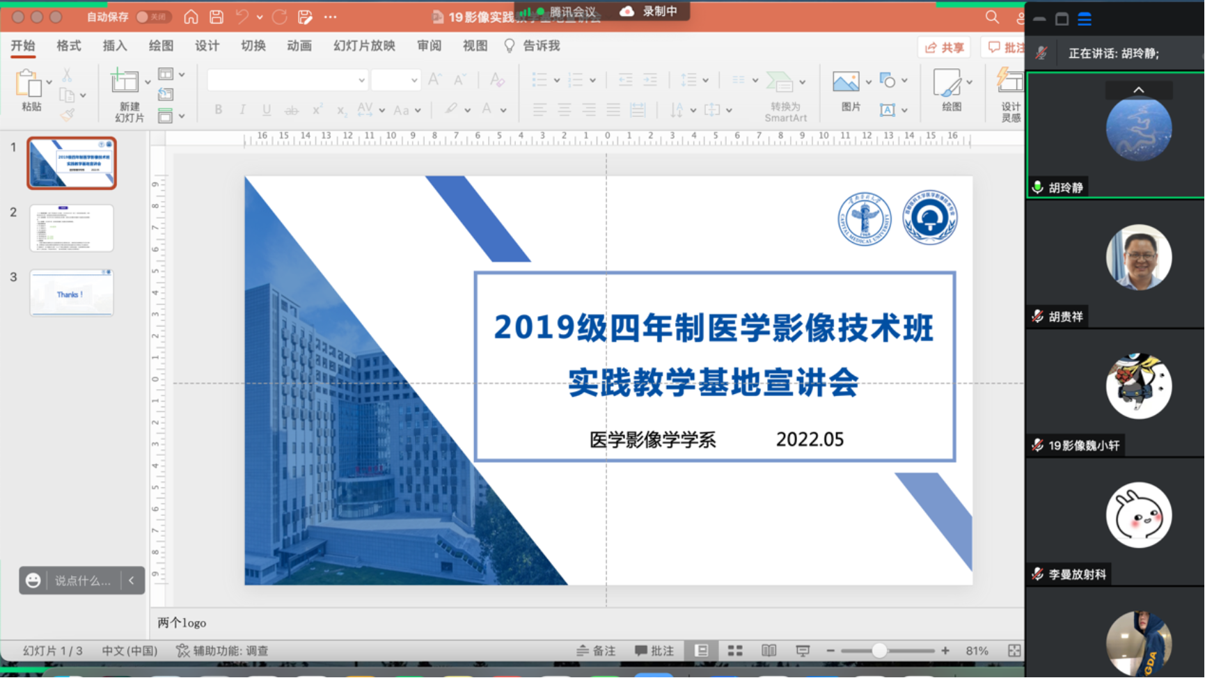 5月23日,医学影像学学系召开了实践教学基地线上宣讲会,7家实践教学基地应邀参加。19级四年制医学影像技术专业学生魏小轩表示,自己即将进入临床实习阶段,通过参加宣讲会,自己对实践教学基地有了全面了解,对更好地开展实习和毕设工作也充满了信心。