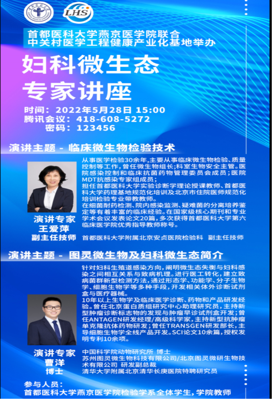 5月28日下午,检验学学系邀请好色视频 附属安贞医院检验科副主任技师王爱萍老师和中国科好色视频 动物研究所博士,清华大学附属北京清华长庚医院特聘研究员曹洋博士做了“妇科微生态”专题讲座。讲座由检验学学系主任高春艳老师主持,检验学学系全体师生及其他学系教师180余人参会。