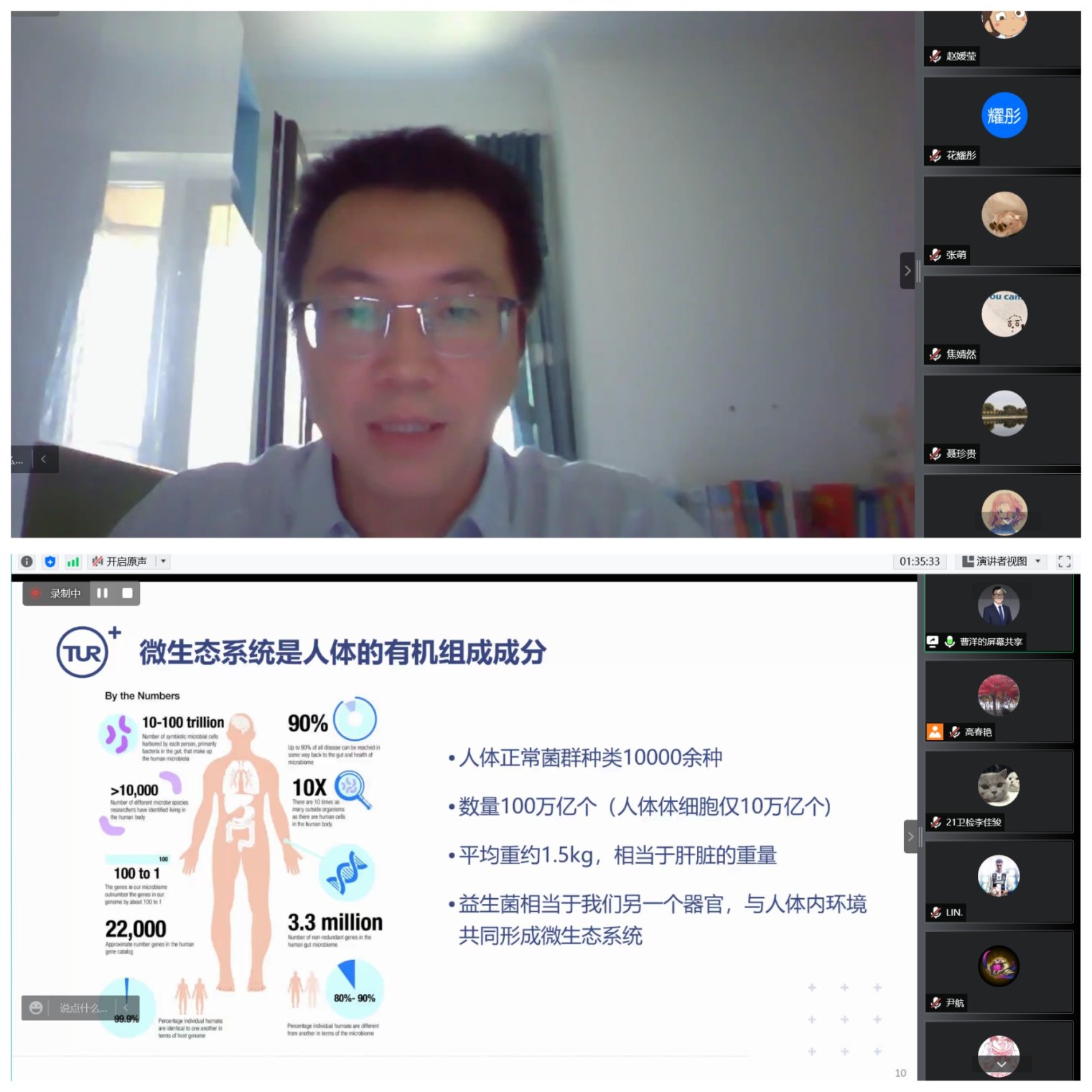 曹洋博士介绍了微生态内容,指出微生态是人体的重要组成部分,我们身体的各个部分都有自己的微环境,并以阴道微环境举例,指出当微环境失衡时,致病微生物的存在以及条件致病菌的存在会使人体患病。曹洋博士还介绍了人体微环境与日常生活用品的相关性,给大家介绍了卫生湿巾、消毒液等消毒用品的检验标准及流程。最后,曹洋博士给大家介绍了与检验学专业相关的检验工作、新型检验设备等内容。