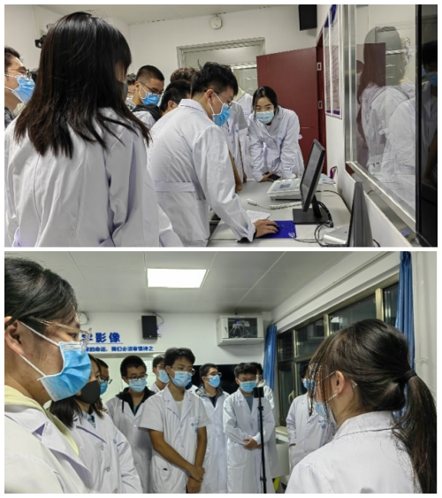 活动开始,首先学习了实验室中所要遵循的规则及行为规范。其后,在志愿者的带领下,2022级新生按照超声诊断实验室、断层解剖实验室、DR实训室、CT实训室,虚拟仿真实训室及MRI实训室的顺序进行参观学习,现场模拟了医院影像科的场景。在参观过程中,部分同学还亲身体验了“病人”、“技师”等角色,沉浸式的参观体验使同学们对未来要操作的医学影像设备有了深刻的印象。