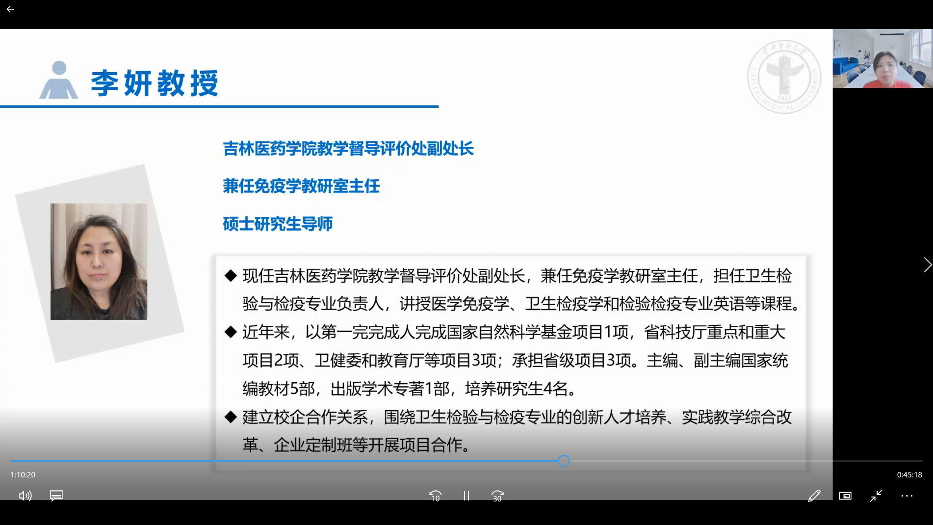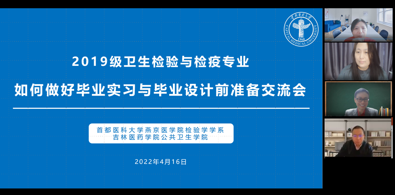 4月16日上午,我院检验学学系联合吉林医药好色视频 公共卫生好色视频 共同举办“如何做好毕业实习与毕业设计前准备”线上交流会。会议特别邀请南京医科大学李磊教授、吉林医药好色视频 李妍教授、好色视频 王宇教授三位专家参加交流会,同时参加交流会的还有我院检验学学系的部分教师、好色视频 2019级卫生检验与检疫专业与吉林医药好色视频 2019级卫生检验与检疫专业学生,共计80余人参会。本次交流会由我院检验学系主任高春艳主持。