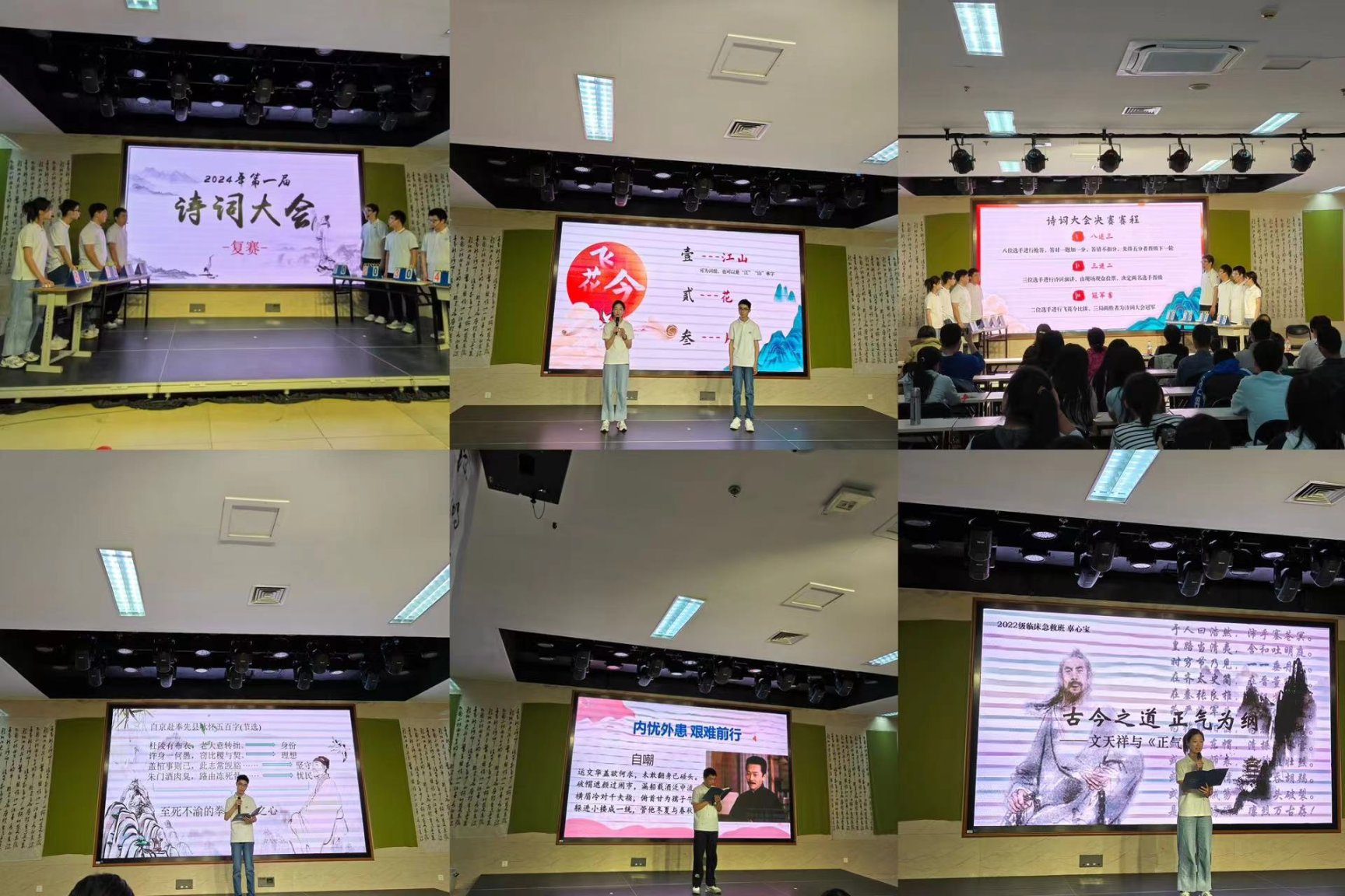 大赛共有245人报名,经过两个月的三轮海选,八位选手脱颖而出。整场比赛分为“争分夺秒”、“诗词演讲”、“飞花令”三个环节。在这三个环节中,参赛选手们全情投入,神思敏捷,酣畅对决,既有沉着蛰伏的镇定,也有孤注一掷的勇气,在千钧一发之间大放异彩,展示了当代青年大学生的朝气蓬勃。现场氛围紧张激烈,精彩表现赢得观众阵阵掌声。穿插于比赛环节之中的还有崔群颖老师、刘硕老师和刘洁老师的精彩点评,丰富了比赛内容,将比赛氛围推向高潮。