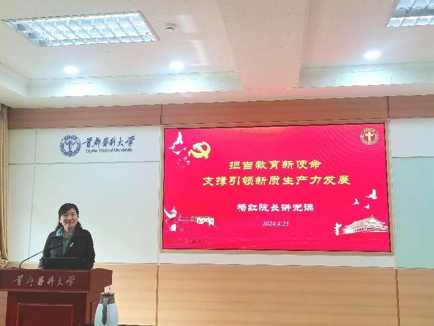 为深入学习贯彻习近平总书记提出的创新理论,贯彻落实好相关指示精神,4月25日,杨红院长以“担当教育新使命,支撑引领新质生产力发展”为题,为医学影像学学系、医学信息技术与管理学学系和检验学学系党支部党员群众讲授专题党课。