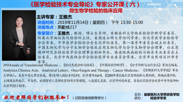 王雅杰教授《医学检验技术专业导论》专家公开课的通知