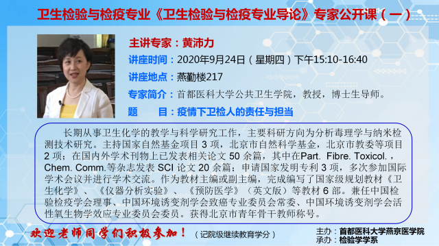 黄沛力教授“卫生检验与检疫专业导论”公开课的通知