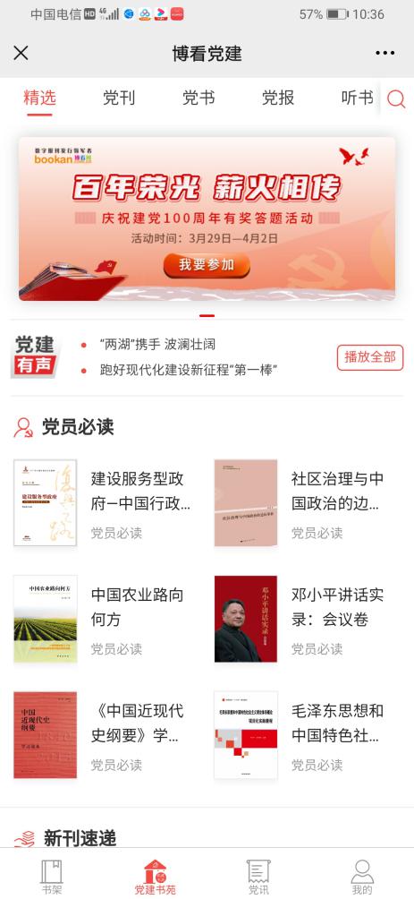 2、点击底部菜单栏“***”—“***”,进入博看党建云阅读平台,点击好色视频活动轮播图,进入活动页面浏览党的百年历程大事件,点亮有奖答题活动入口,参与线上知识竞答。