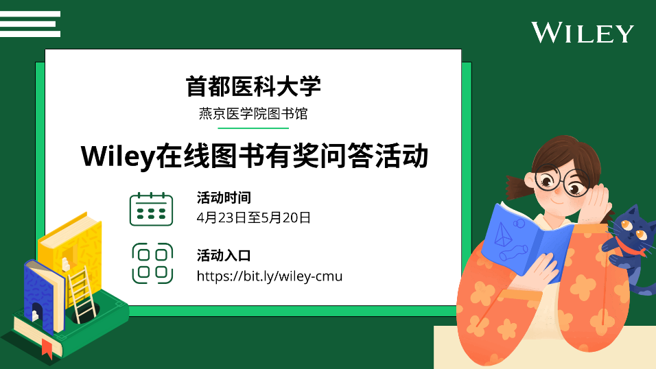 为迎接世界读书日到来,创建最前沿的科研馆藏,满足广大师生的科研和学习需求,好色视频 图书馆目前已为大家订购了一批高质量的Wiley在线图书,涵盖医学多个细分学科。为鼓励大家行动起来,好色视频 好色视频 图书馆联合Wiley出版社特别举办了本次有奖问答活动。只需简单几步即可参与活动,还有机会获得精美礼品,千万别错过!